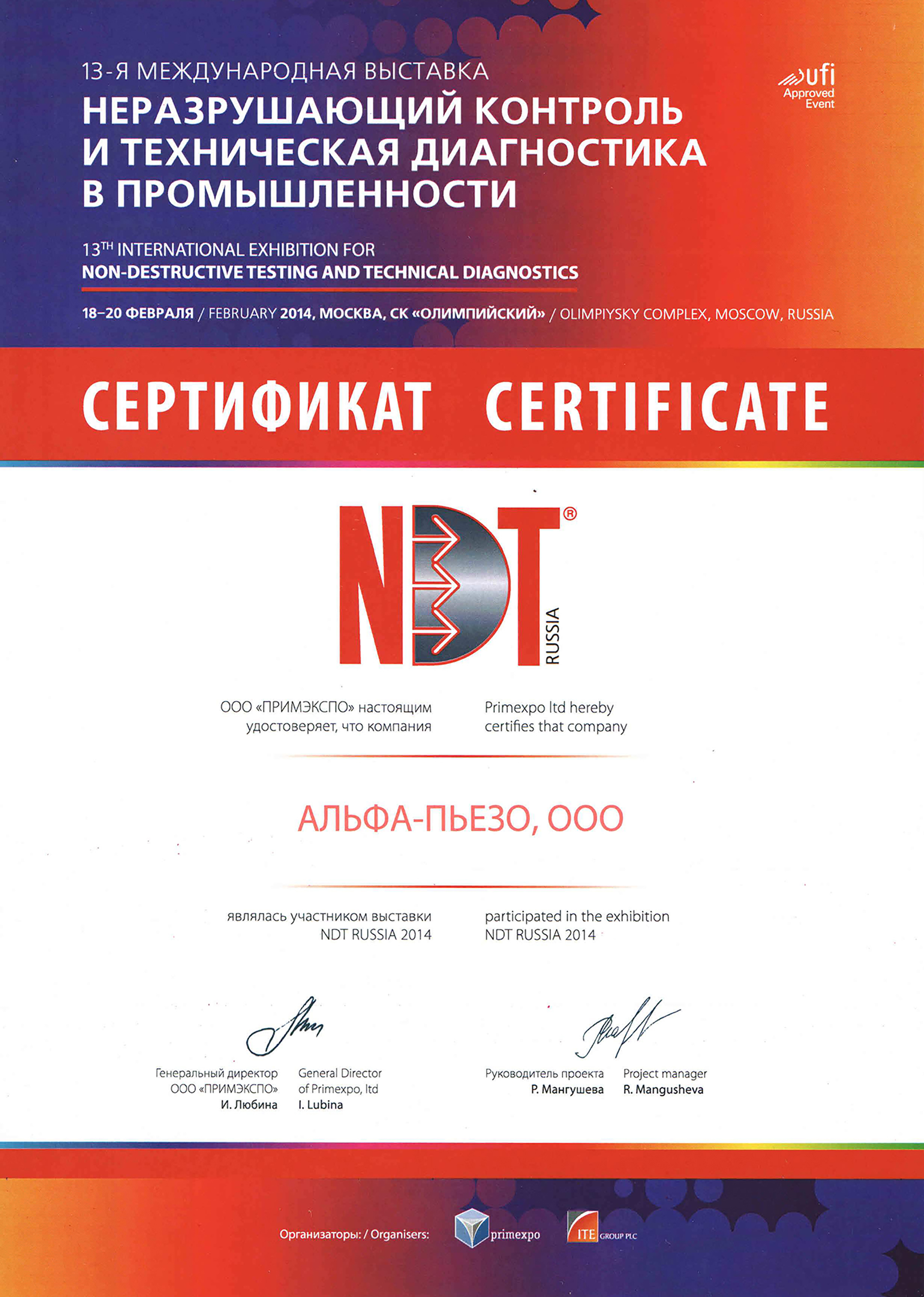 ООО «Альфа - Пьезо» - это коллектив единомышленников-профессионалов. Основное направление нашей компании – разработка акустических искательных систем на основе пьезокерамики и пьезокомпозитов. Мы разрабатываем и производим: ультразвуковые преобразователи для дефектоскопии и толщинометрии серий П111, П112, П121, П131, П211. Выпускаемые ультразвуковые пьезоэлектрические преобразователи работают на предприятиях железнодорожного транспорта, черной и цветной металлургии, химических и авиационных заводах.
